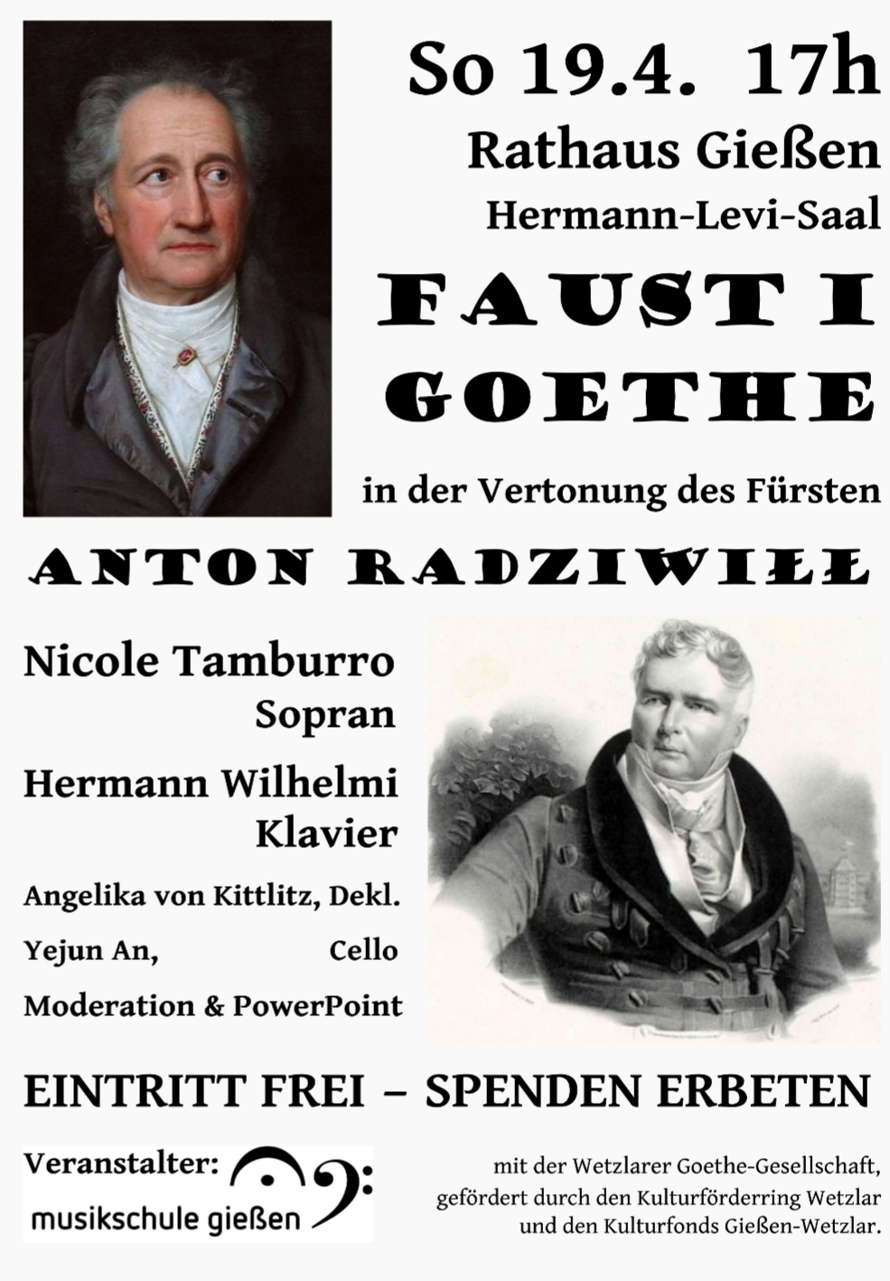 Nach unserer Veranstaltung über die Faust-Vertonung des Fürsten Radziwiłł anlässlich Goethes Geburtstags am 28. August 2025 konnte die geplante Wiederholung der Aufführung in Gießen leider nicht stattfinden. Sobald Ort und Datum dieses Ersatztermins feststehen, informieren wir Sie gern per E-Mail.